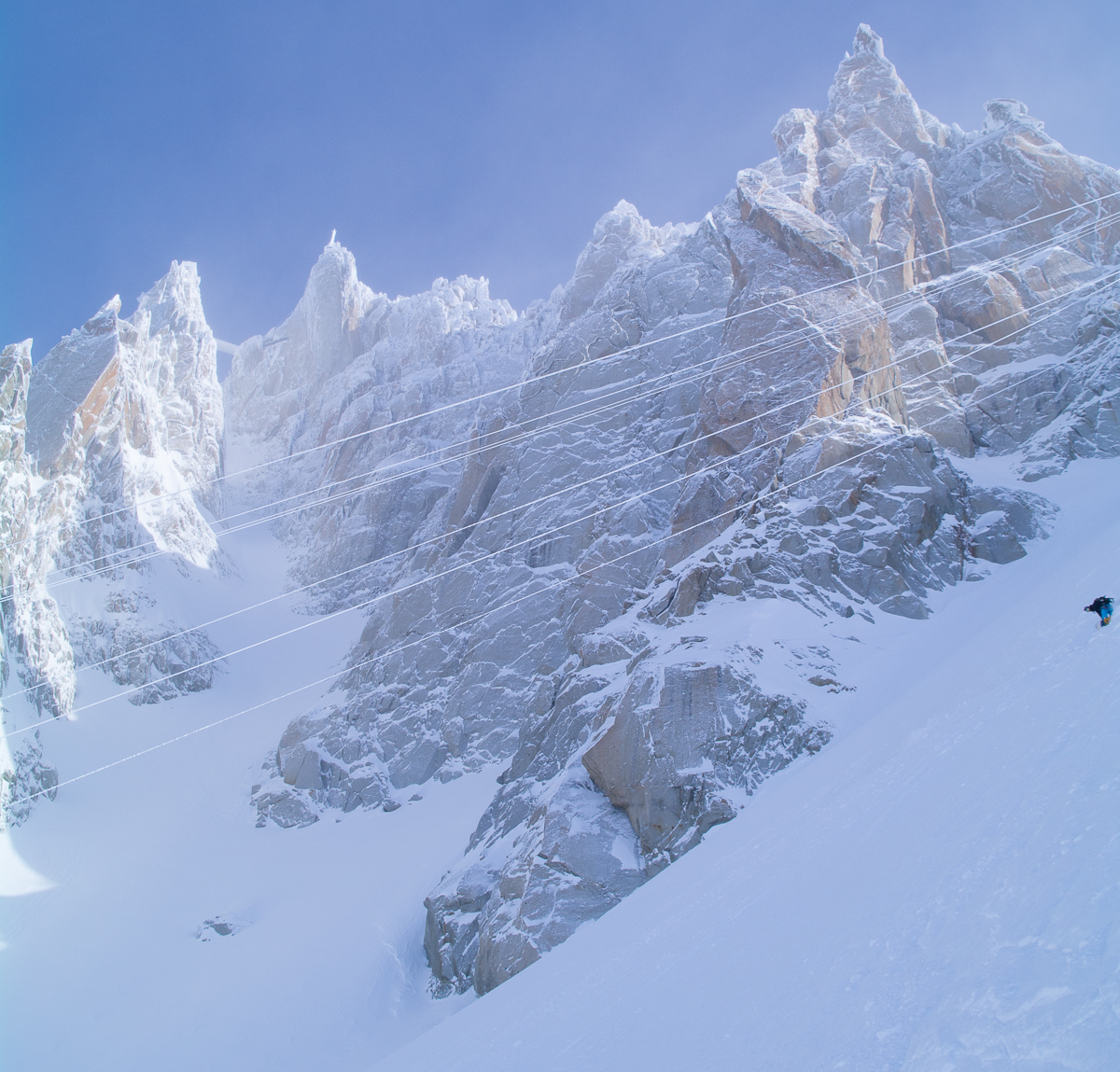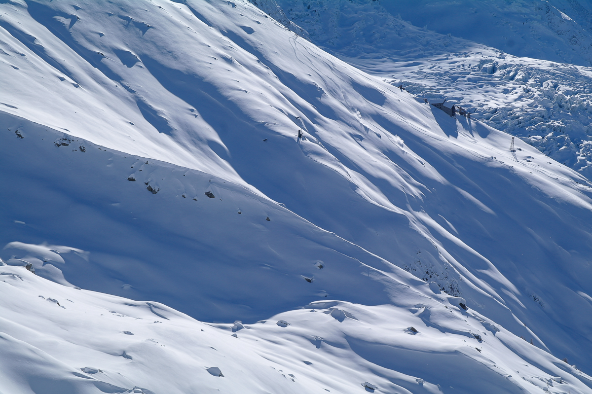 Yesterday I hooked up with Sylvain Reynaud for what had the promise to be an exciting day out. Chamonix had been stormed on for several days limiting the skier’s choice to the tree line. The forecast was for better weather in Italy so we made a vague plan to go there but I had a niggle in the back of my mind about Helbronner, knowing it hadn’t been skied much lately and with possibly 2 m of new snow, that things would be more in the catastrophic scale rather than controllable. I knew Sylvain would be hungry after a week at work but after meeting at the tunnel we changed plans and headed to the Aiguille du Midi.