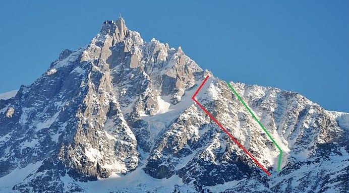The Aiguille du Midi. The Rond run is the red line with the Cosmique Couloir in green. 1500 m of Freeride to town remain below this photo.