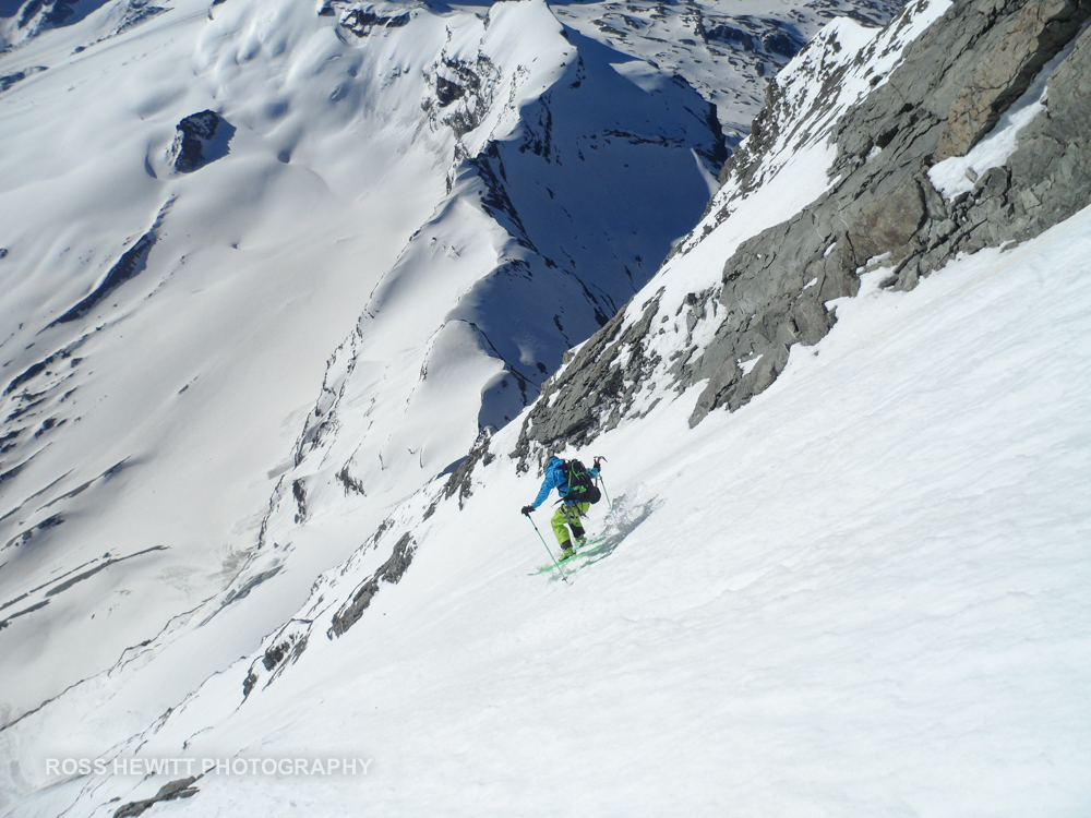 After side slipping a few metres to get the feel of my skis underfoot and edge grip I felt ready for that all-important first turn. Time to commit… no problem, this is going to be fine. As we dropped height and the angle eased to the 50º range the snow softened further and the turns became softer and more rounded. Once we entered the central snowfield the angle was around 45º and we had a lot of fun skiing fluidly and playing with the sluff down to the lower rocks.