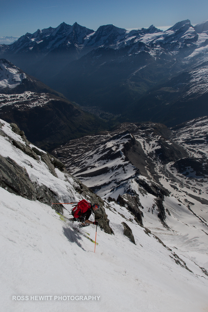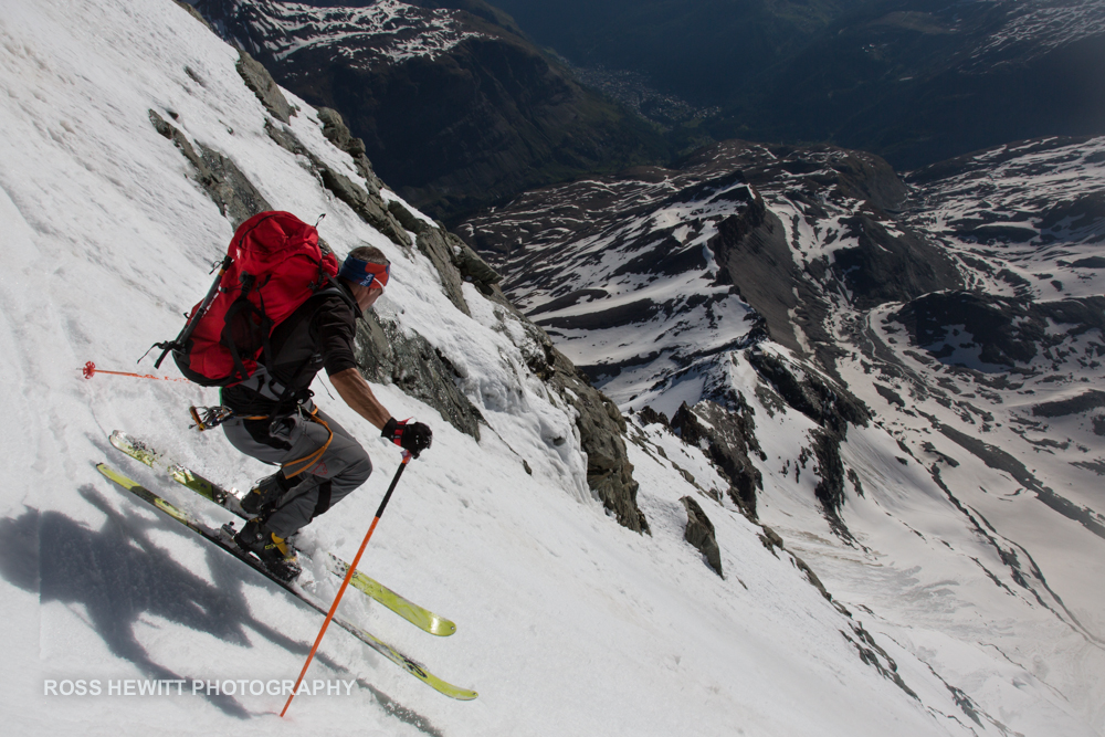 From the top of the skiable terrain the first turn would be on sustained, unforgiving 55º spring snow. Simply standing stationary and holding and edge had every fibre in the body working overtime. I was still clipped to my ice axe for added security while I adjusted my camera settings. Mikko left the sanctuary of his ledge and with axe and pole in one hand committed without hesitation into a series of beautifully-linked chop turns that you’d have been proud of on a lift accessed Midi North Face run with fresh legs.