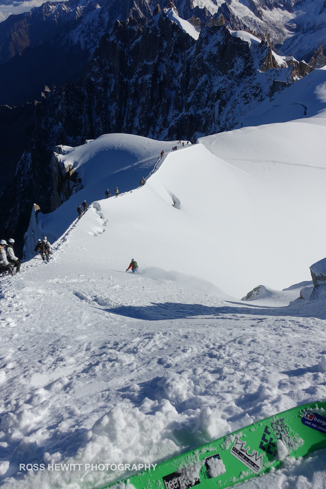 As the autumnal days shorten and the shadows grow across the valley, I realise how important it is for me to visit these high sun-drenched places. Its had been over 2 months since I visited the Midi and on return its beauty stunned me. Couple that with the fun of sliding downhill on a pair of skis and its obvious why its he best ski lift in the world aka ‘The Mothership’. Our first turns of the 15/16 season as Tom Grant and myself get training and acclimatising for our New Zealand ski trip next week.