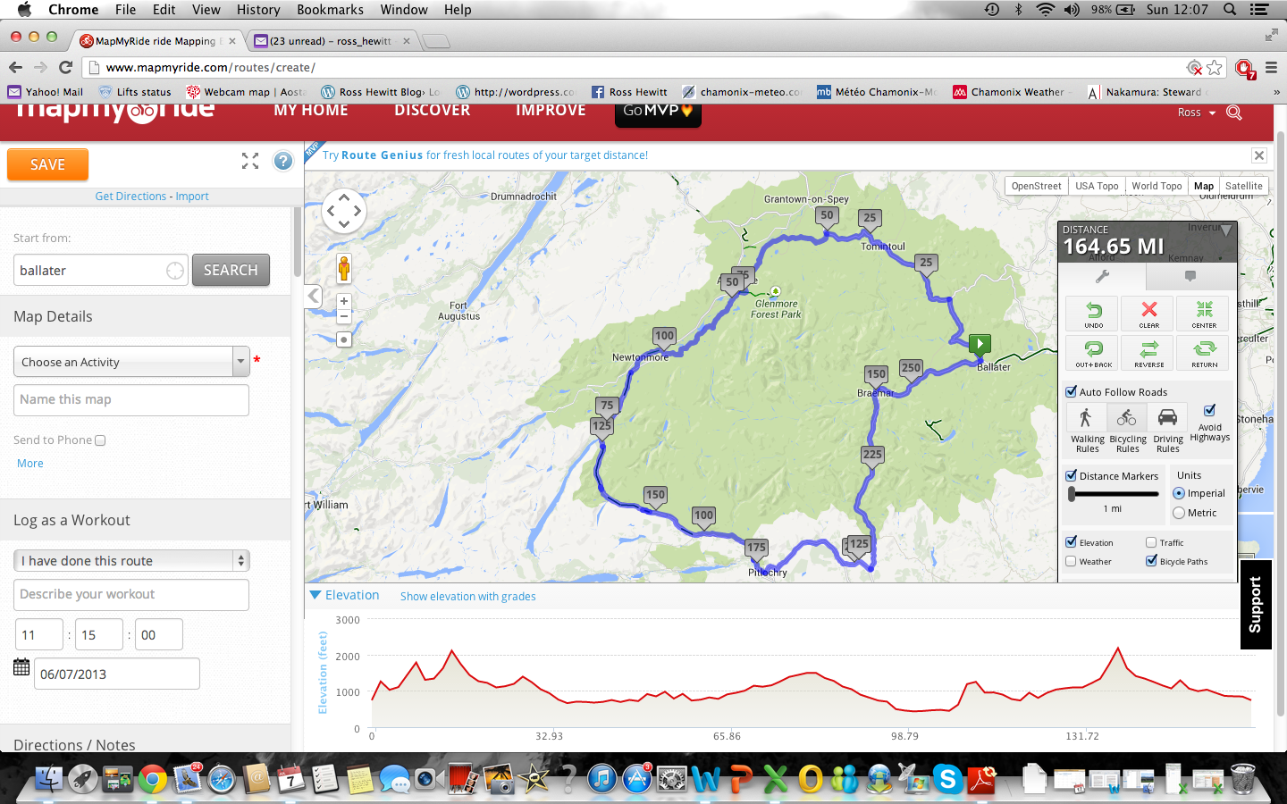 The last 7 miles was all on the flat and the monument on Banchory’s Scolty Hill was a friendly familiar sight visible from several miles away and acting like a homing beacon drawing me back to the car. The bunions on my feet from skiing were pretty sore by the end along with my right shoulder and I was glad to finally climb off the bike and into my car after 13 hrs 10 mins car to car. The main factors in making this ride solo was a day with no wind and cool temperatures and keeping heart rate below 140 throughout with a 160 limit on the major steep climbs.