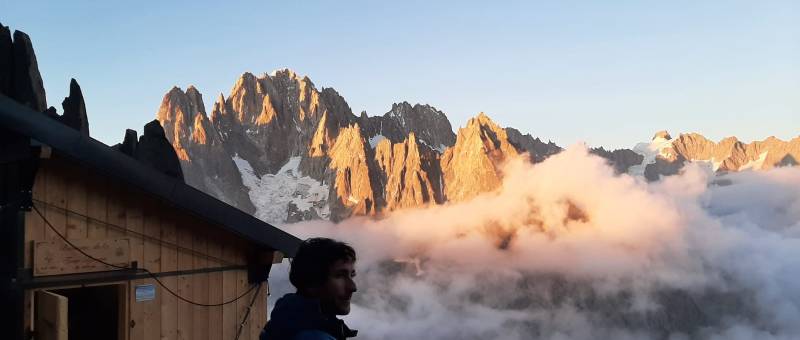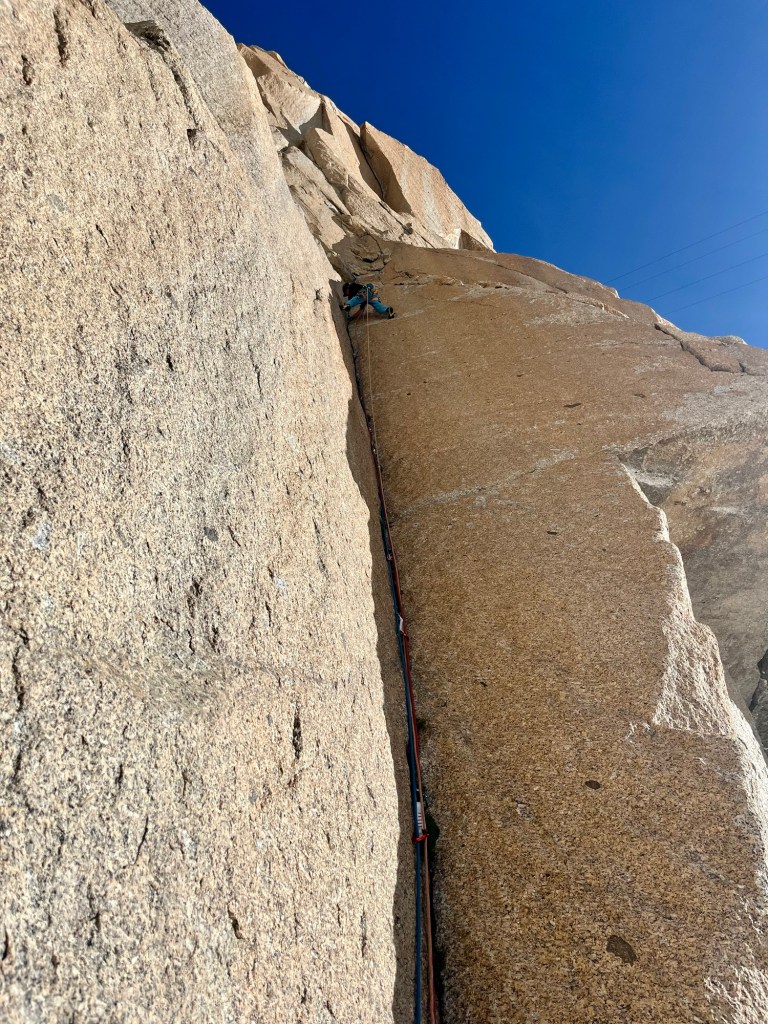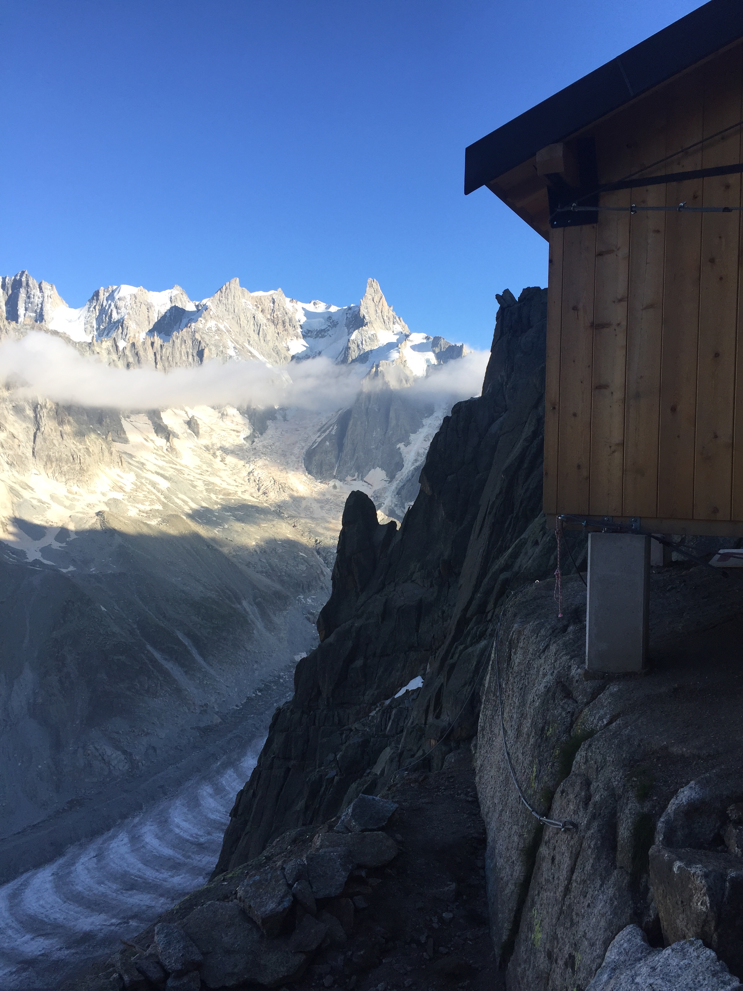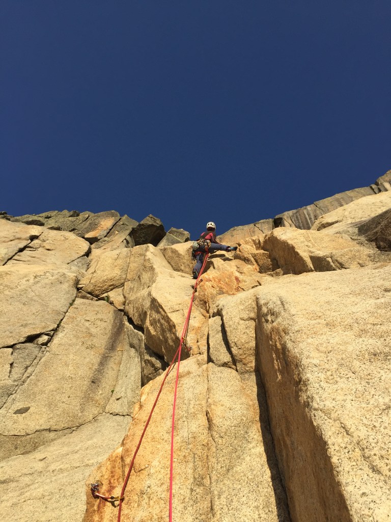 There are Chamonix Aiguilles (needles) and Chamonix Aiguilles. This is one of the latter, as sharp and pointy as a 700 m rock spire can be. The thought of the pioneers lassoing the summit and hand over handing up a hemp rope still makes my palms sweaty. The exposure levels on the summit kept me straddling the blade of rock – one leg either side. We climbed the modern magnificent political crack route named Republique Bananiere that the maestro Piola rated in his top ten Mont Blanc Massif granite routes. ED 6C and 700 m of magic including a 50 m dihedral.