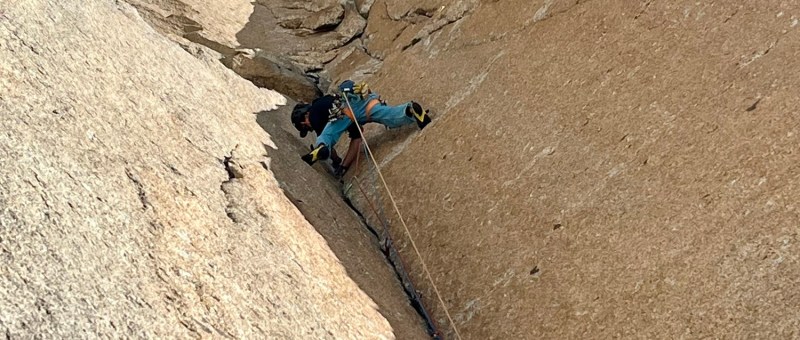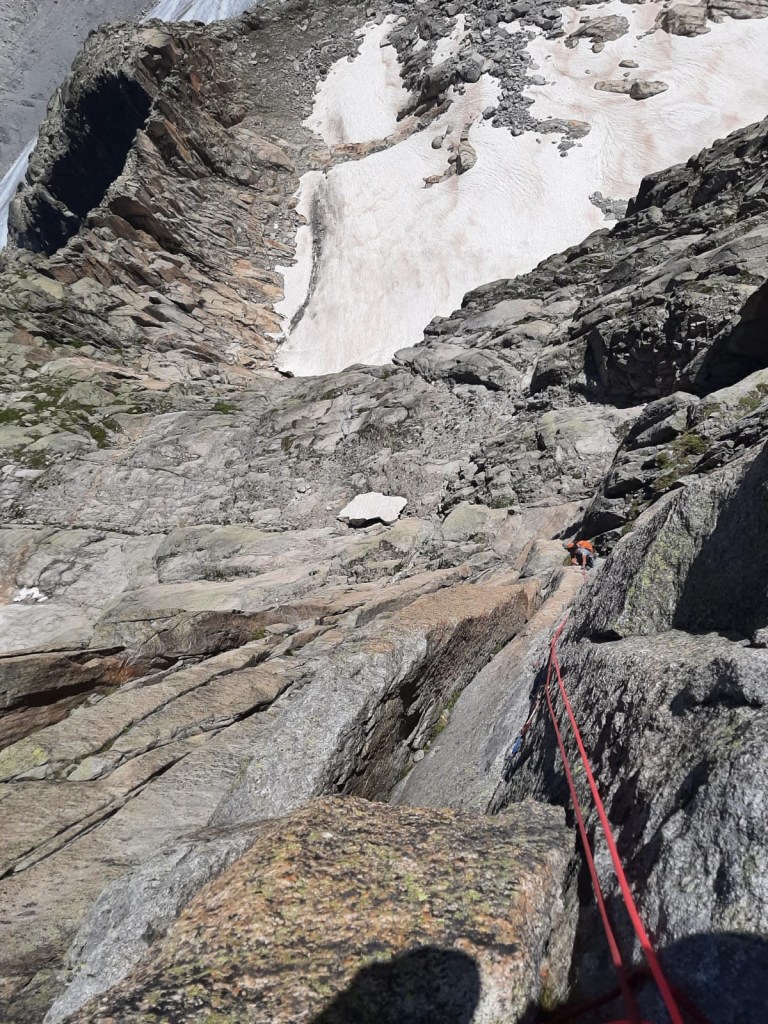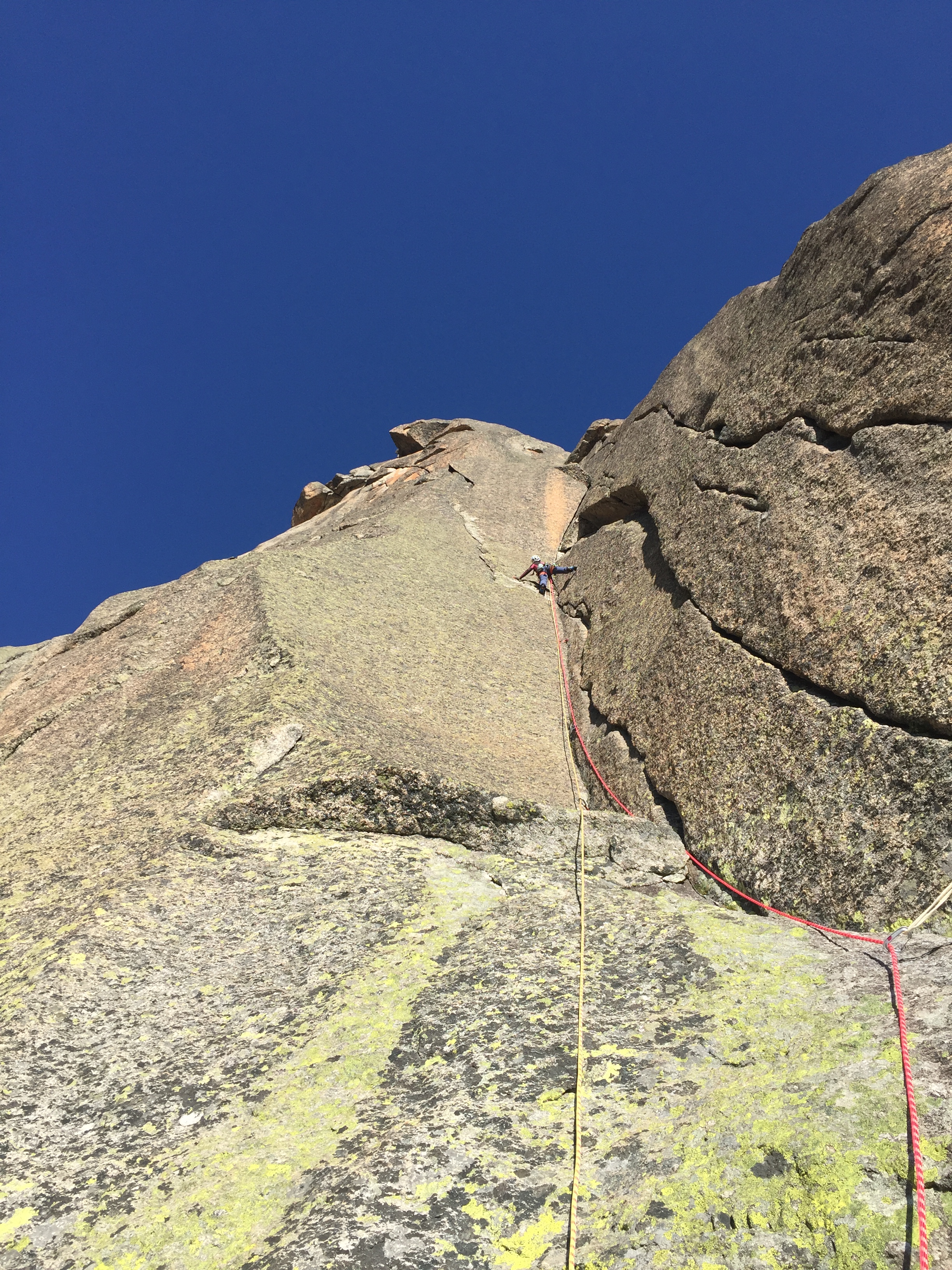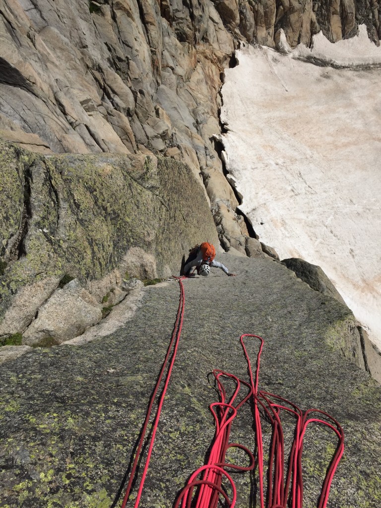 Beautiful outing to the Trelaporte of Envers des Aiguilles to escape the valley heat. A fabulous route following jamming and layback cracks.