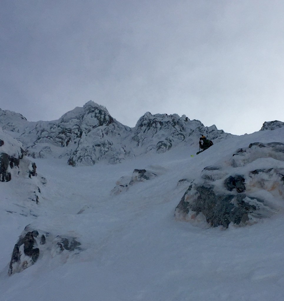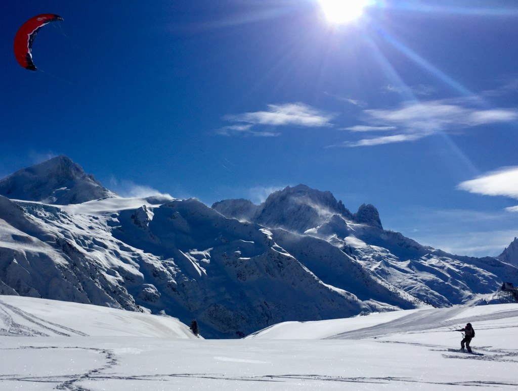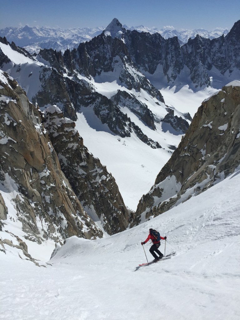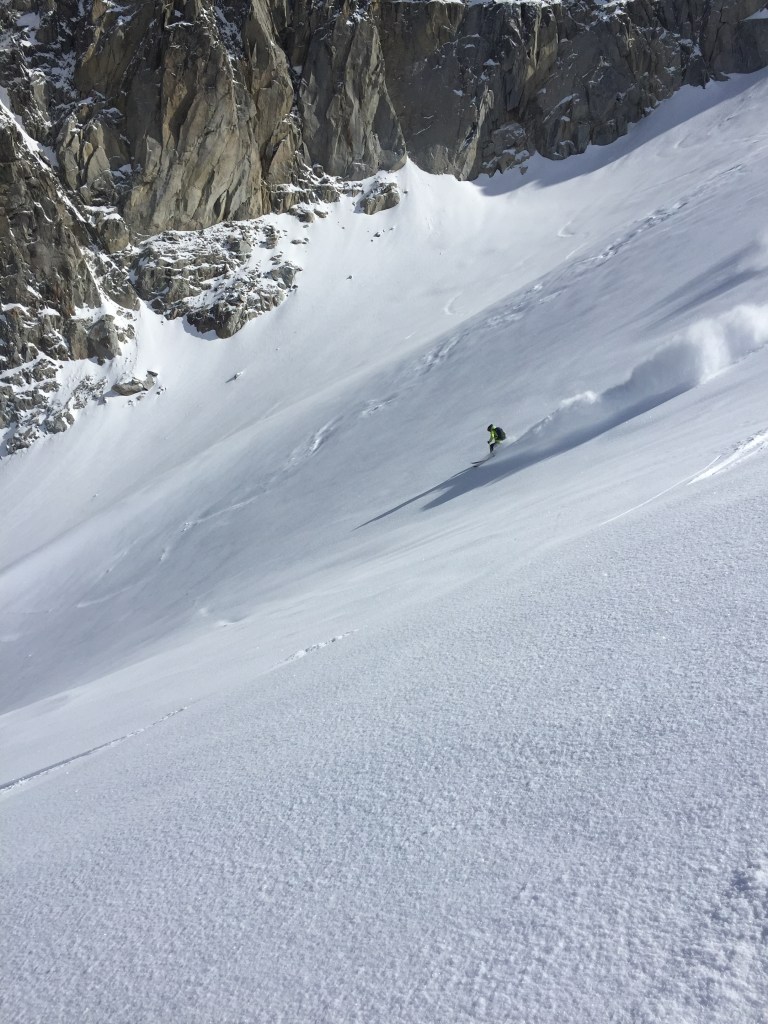 February was another drought and after skiing Pointe Percee North Face on disgusting snow, it was time to change tactics and look for better options. A ski and fly out the Pas de Chevre was a extrordinary experience for me, skiing those big open powder slopes then flying effortlessly over the combat zones down to beers in the sun at Argentiere. I’m a novice paraglider and it was my first time employing ski n fly tactics in the mountains. Pas de Chevre was one of my big goals for this winter and boom, it happened like clock work. For me ski n fly will be my future tactic of choice for the big lines like the Peuterey Ridge, I just need to keep building my experience and abilities slowly and surely.