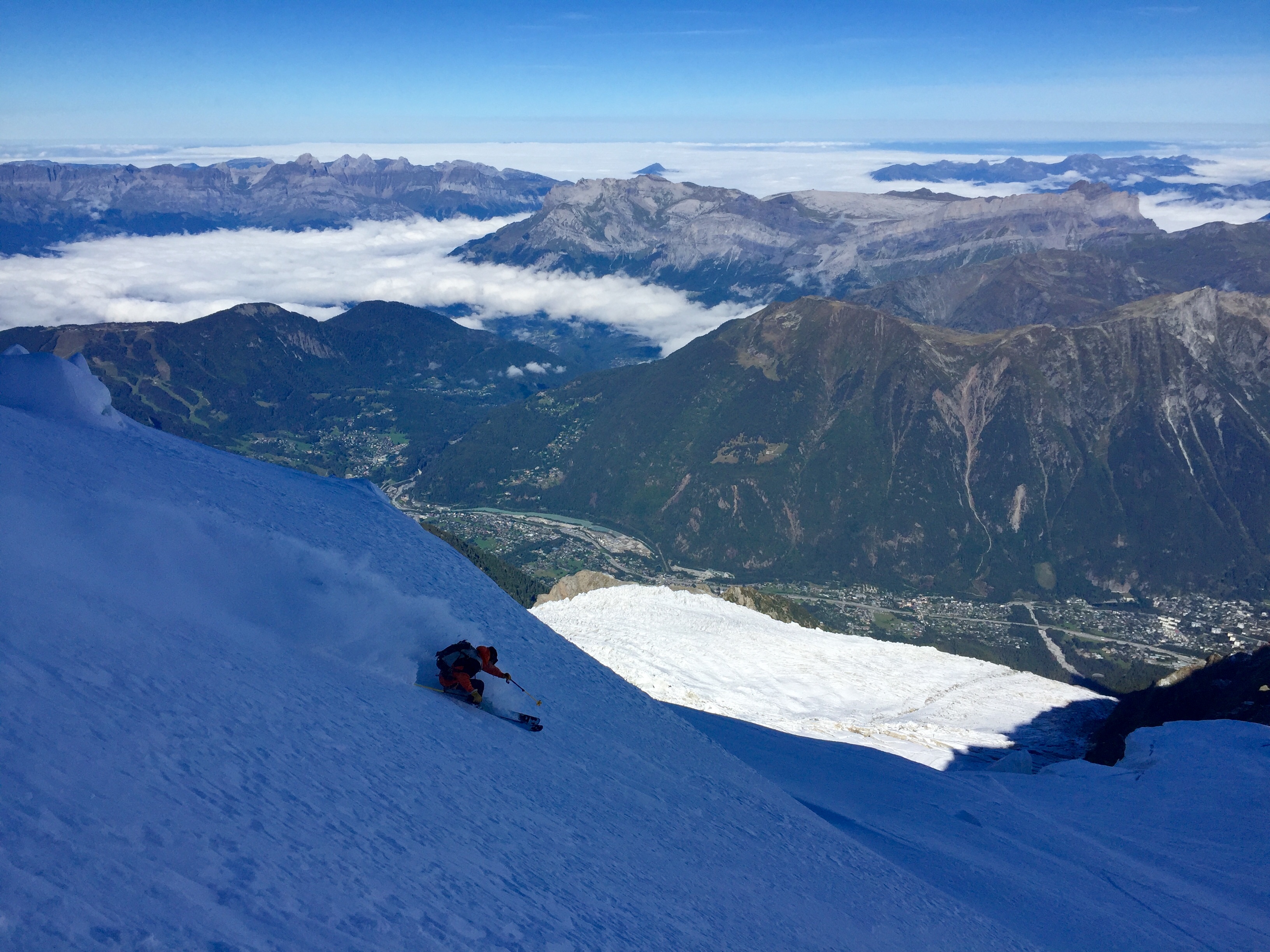 Lovely ski yesterday skiing above Chamonix’s Aiguille du Midi on Mont Blanc du Tacul. 600 m of lush cold blower powder down to Col Simond. And its September. What a gift from the Gods! With the warm sunshine, clear autumn air, and quiet mountains, its just pure pleasure being out there. Today I had the pleasure of skiing with young passionate skier Chamoniarde Nico Borgeot who I met skiing the Mallory (under the cables of Aiguille du Midi) in May.