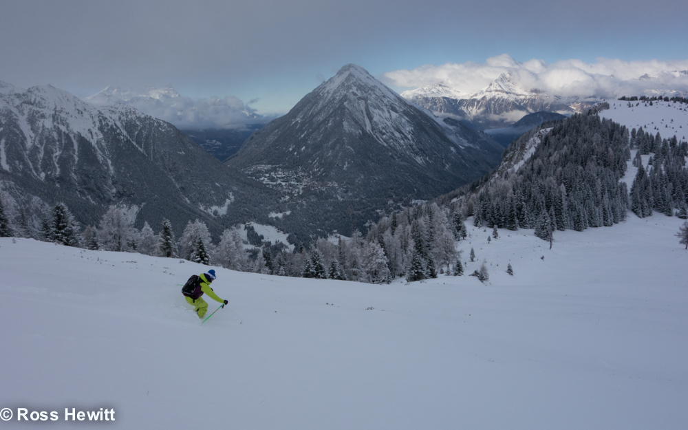 Corn harvesting on Bel Oiseau south west couloir from the summit to the dam with Minna Riihimaki and Tommasco Cardelli. The day got weird near the end.