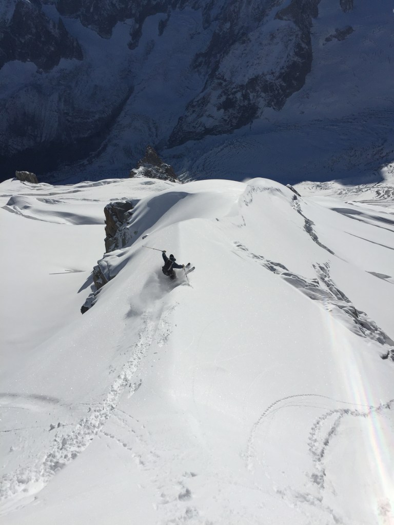 February was another drought and after skiing Pointe Percee North Face on disgusting snow, it was time to change tactics and look for better options. A ski and fly out the Pas de Chevre was a extrordinary experience for me, skiing those big open powder slopes then flying effortlessly over the combat zones down to beers in the sun at Argentiere. I’m a novice paraglider and it was my first time employing ski n fly tactics in the mountains. Pas de Chevre was one of my big goals for this winter and boom, it happened like clock work. For me ski n fly will be my future tactic of choice for the big lines like the Peuterey Ridge, I just need to keep building my experience and abilities slowly and surely.