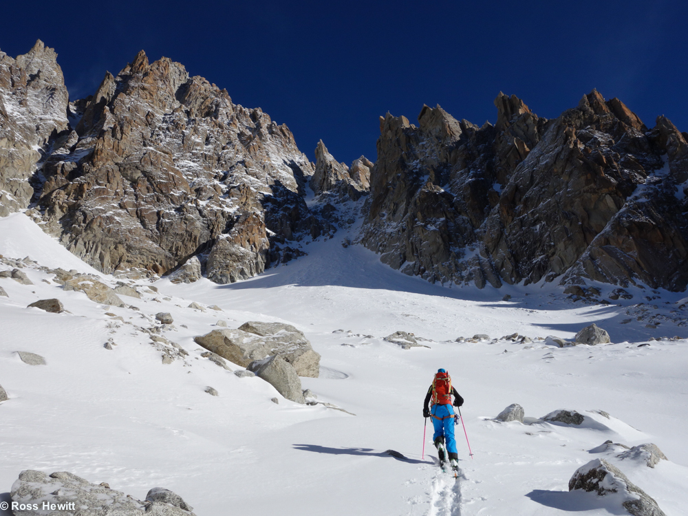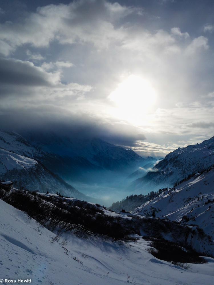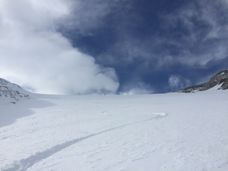 Arriving in Tignes there was certainly a couple of feet roadside but the visibility was poor and we spent the morning doing a very humid skin about 400 m vertical out of town. Once back in Tignes there was signs of the sun coming out and we decided to be positive about it and go up the Grands Motte. The clouds parted, the sun came out and so it began, with a little taste of the magic, hooning down the glacier whooping with delight, blowing up cold smoke behind us.