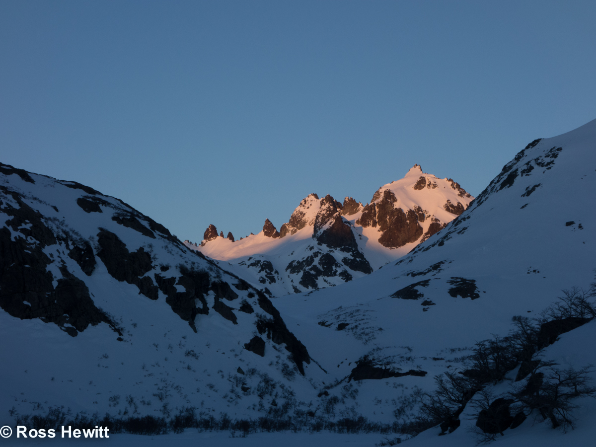 Dawn hits as we start the climb up the east face of Mt Cook