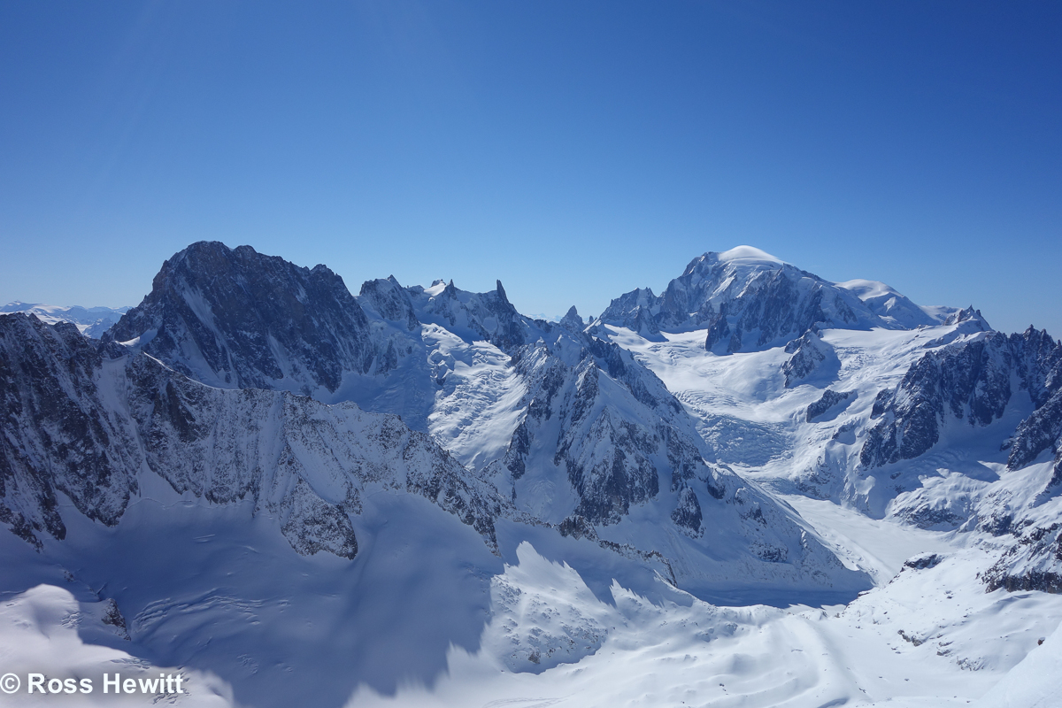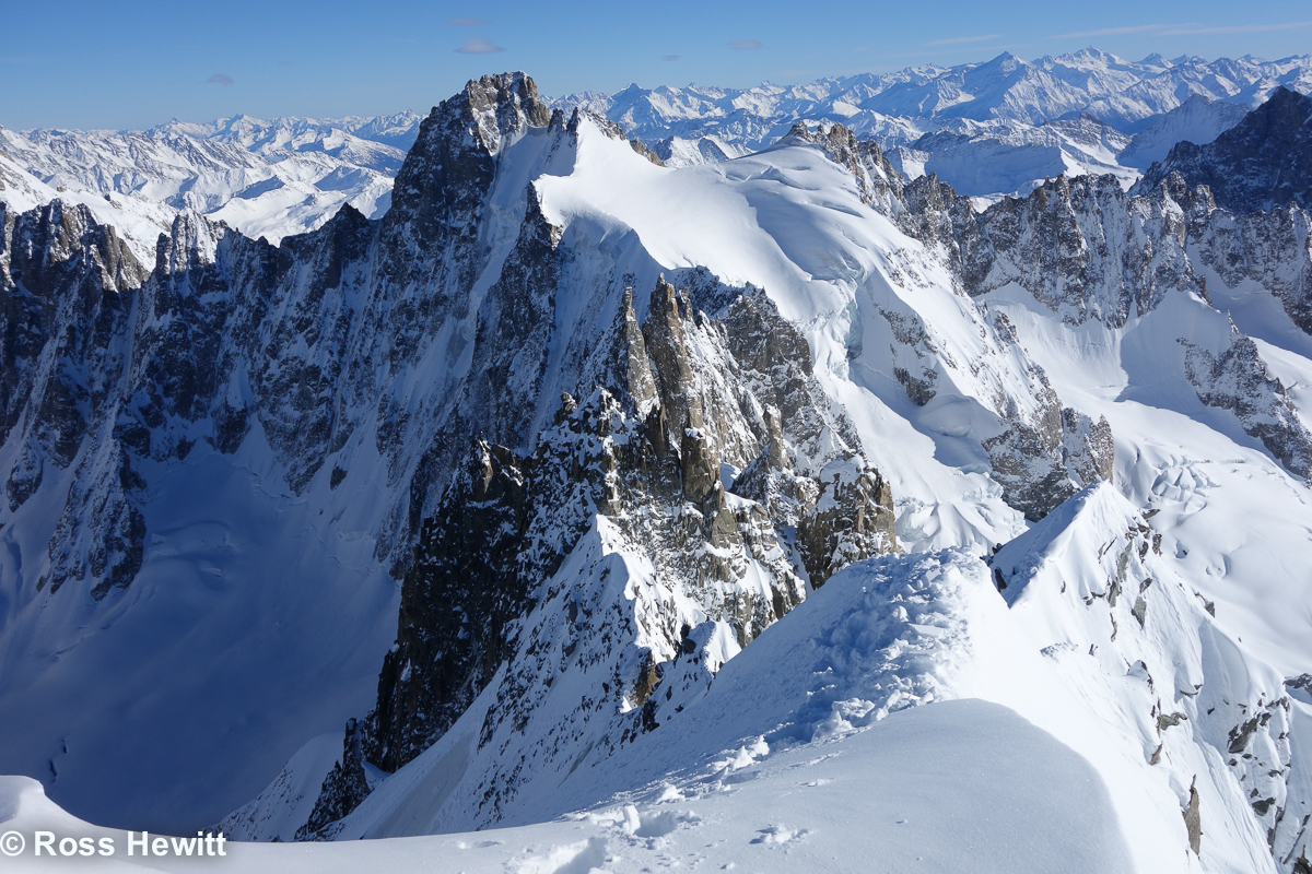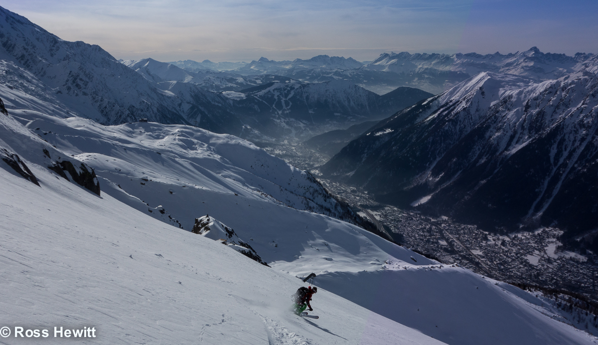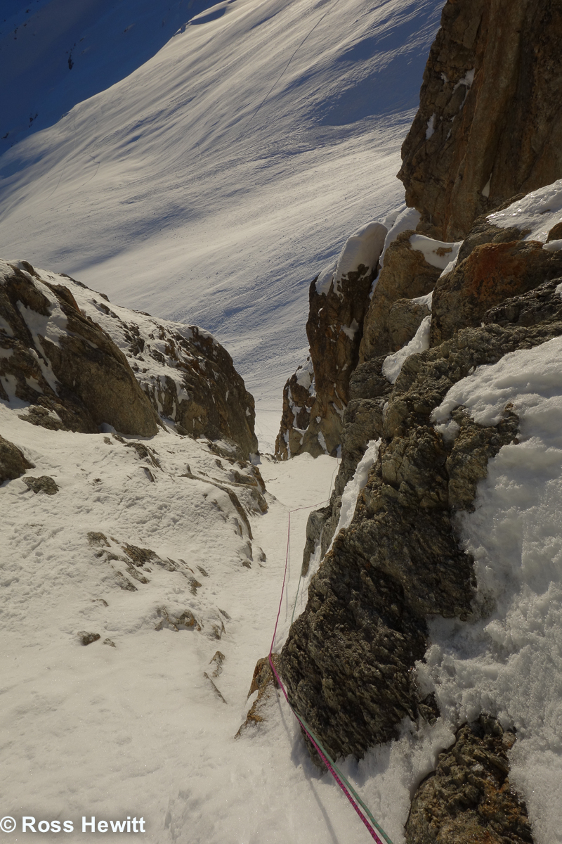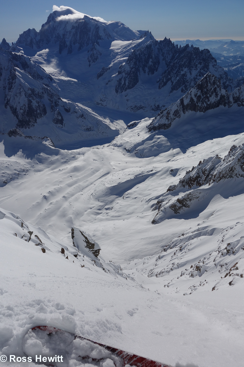 On Christmas Eve I had the pleasure of skiing with Jesper Petersson and returning to the Argentiere basin. We skinned from Bochard over the Col des Rachasses towards the Col de Chardonnet to have a go at the South Face. Rotten snow meant getting off the Argentiere glacier was really tough and we had been going for 5 hours by the time we got to the face. The weather was changing rapidly and by the time we climbed the initial couloir the wind was howling, tugging incessantly at the skis on our bags trying to lift us off the mountain. The decision to ski down was pretty simple!