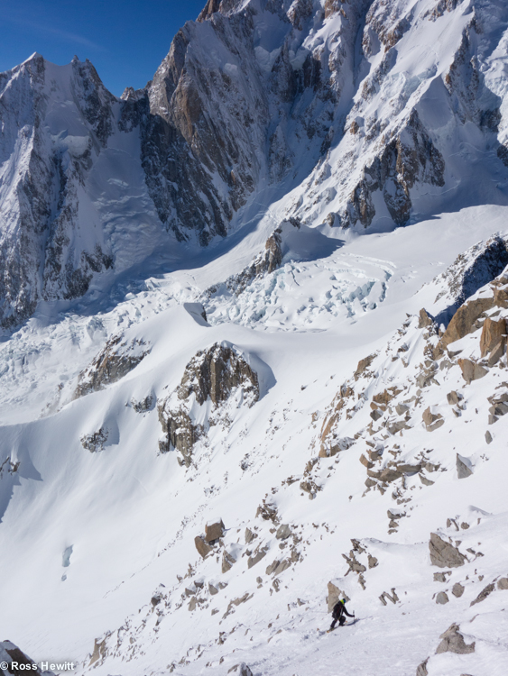 Today I definitely did not feel I was winning. I woke up and wasn’t feeling it, I knew about a dozen people wanted to go to the same area, the question do I go, don’t I was running in my head. One of the routes we were talking about requires ropes and I couldn’t be bothered with any rope faff either with more than one other person so that made my choice of line easy, the South side of Tour Ronde from the summit. All was going well on the approach and we soon left the crowds behind but then the day started to go pair shaped for me. While I was at the bergshrund putting my crampons on, one of my skis that I had placed tail down into the snow suddenly slipped through the pow and took off down the glacier. I’m stilling getting used to rockered tails and should have embedded it deeper. We watched in vane hoping it might flip over but a 130-140 wide ski is pretty stable and it disappeared out of site leaving a trail in the pow. I said cheerio to De Masi and Miss Daily and headed off down the glacier on one skis thinking I’d be going back to helbronner to download minus a ski and binding. About a km down there was a 50 m wide crevasse with a snowbridge 30 m down and on it nothing else but my lost ski. A quick abseil off my other ski and I was back in the game with 2 skis! I just had to catch up with Davide and Liz who were climbing up the normal route on Tour Ronde and after an hour of hard work I joined them on the summit.